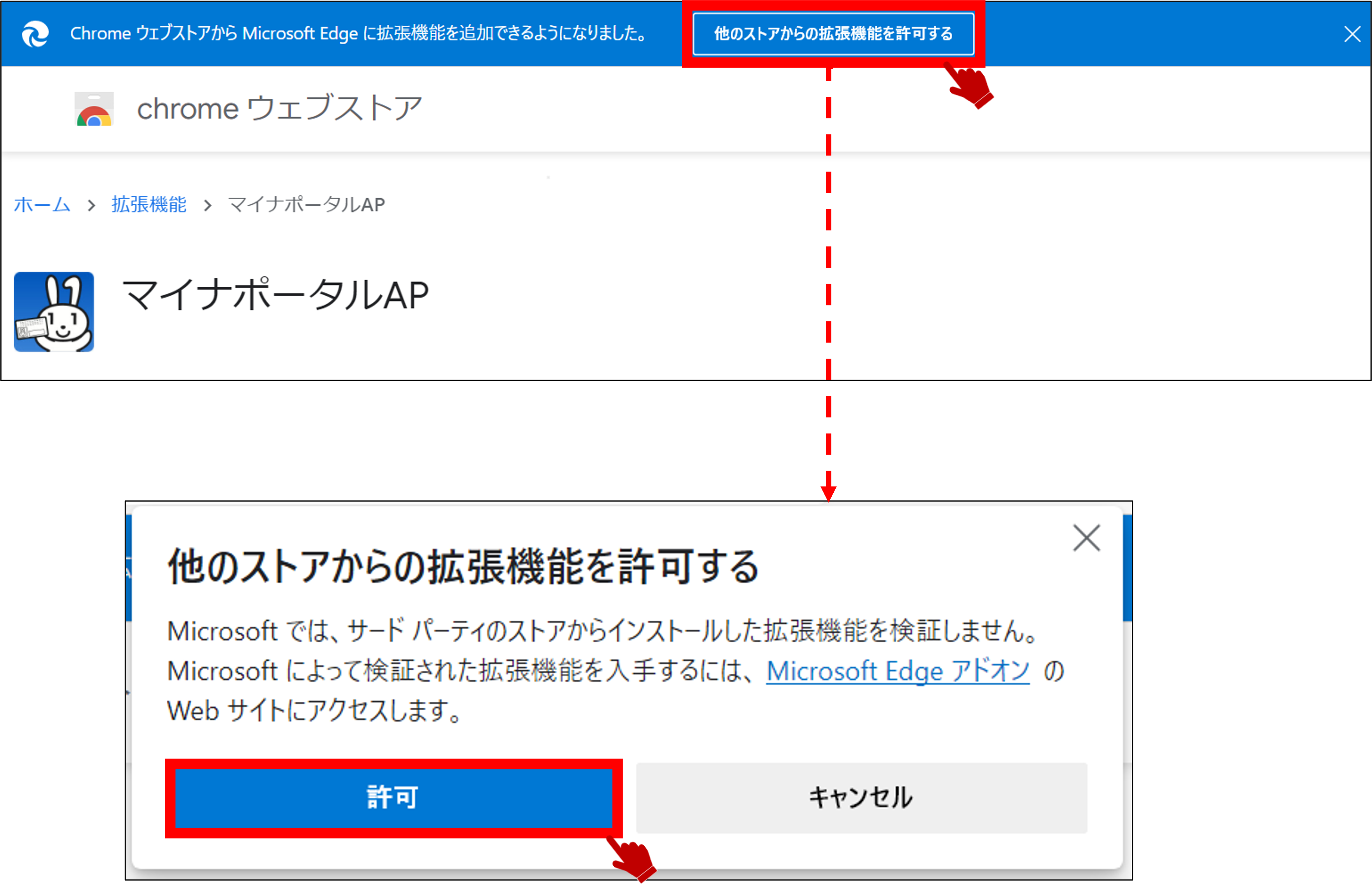 WindowsでMicrosoft Edgeを使用してマイナポータルを利用するための接続用のアプリケーションを、Chromeウェブストアとマイナポータルからインストール/バージョンアップします。