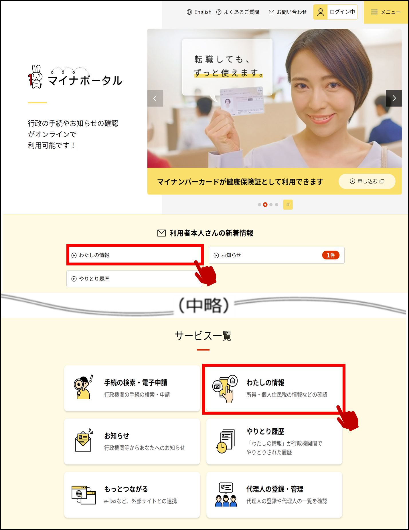 > 1: ログイン後トップページから、わたしの情報を選択する