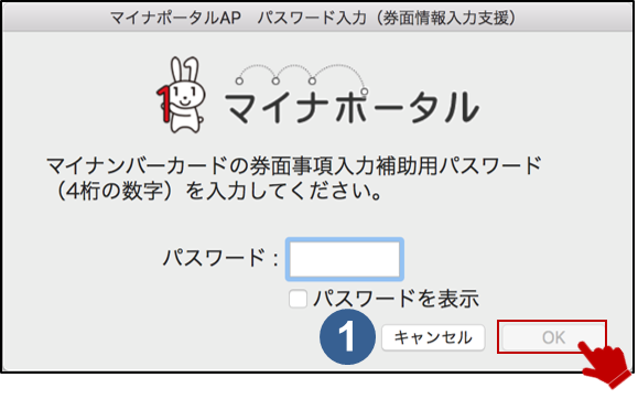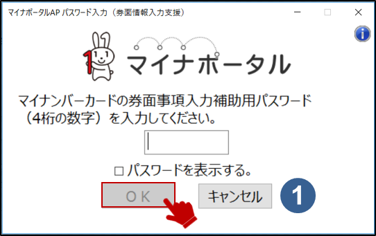 券面事項入力補助用パスワードを半角数字4桁で入力し、OKボタンを押します。