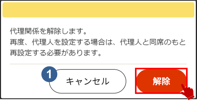 キャンセルボタンは、代理人の解除をやめる場合に押します。代理人の情報に戻ります。