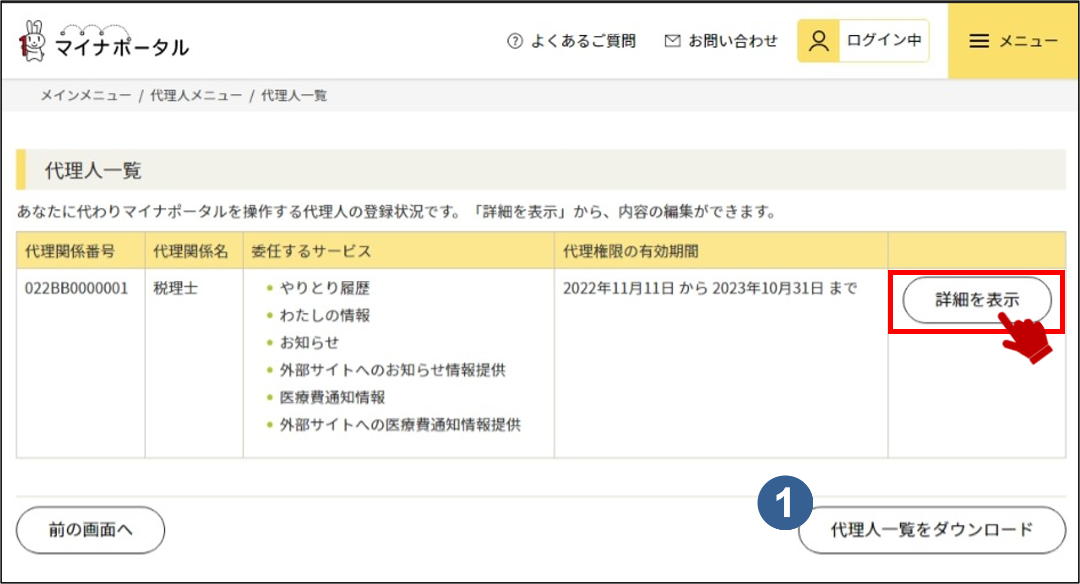 代理人一覧をダウンロードボタンは、表示されている代理人の一覧を利用中のパソコン等に保存します。