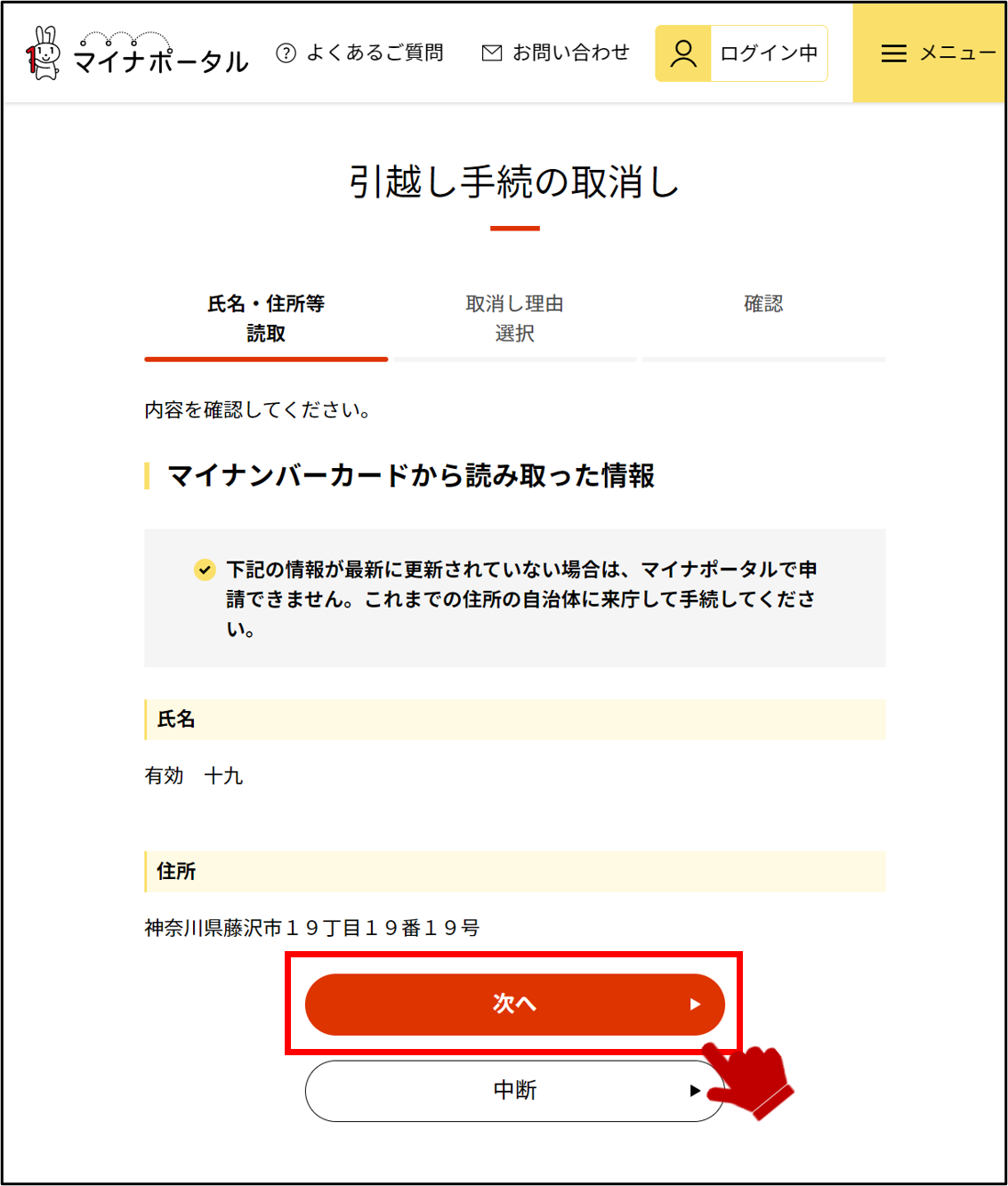 ※申請状況によってはマイナポータルでの取消しはできませんので、これまでの住所の自治体の窓口に来庁し、取消し手続をしてください。