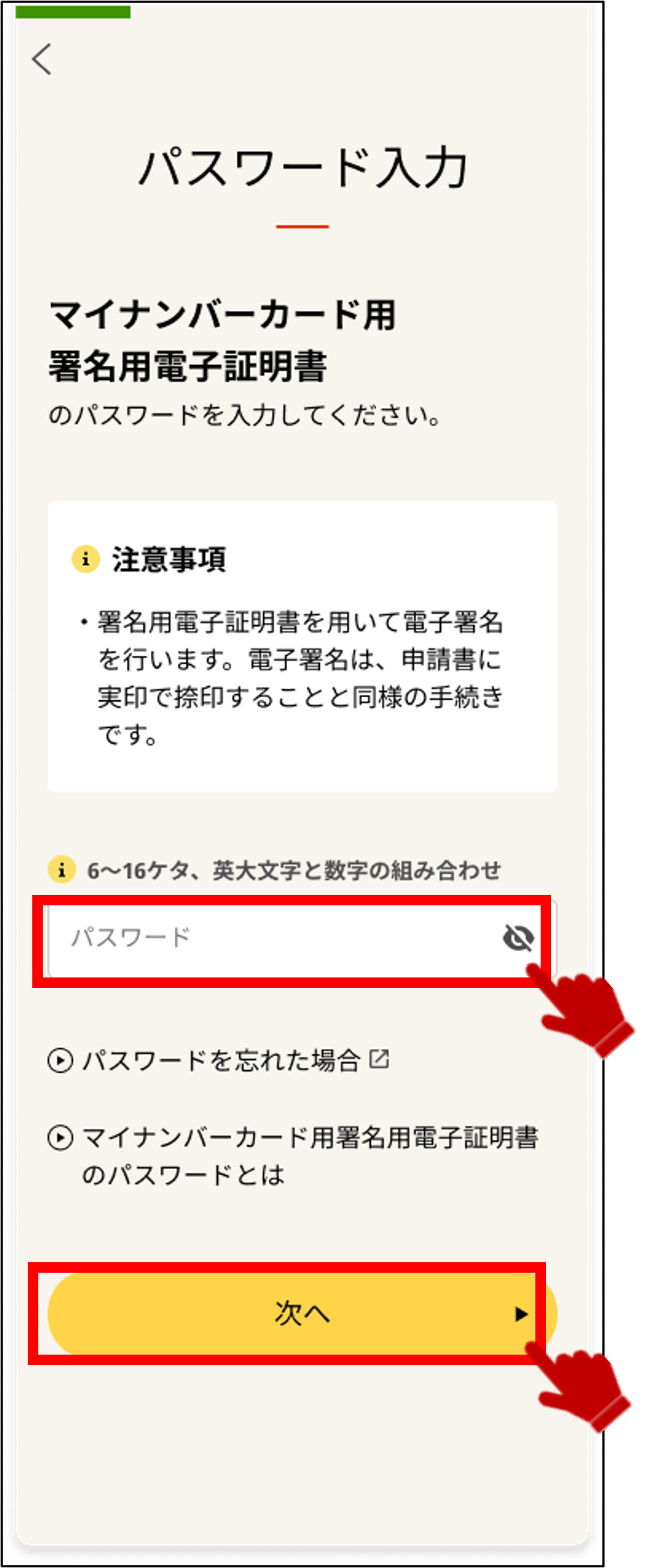 > 6: スマホ用署名用電子証明書のパスワードを入力する