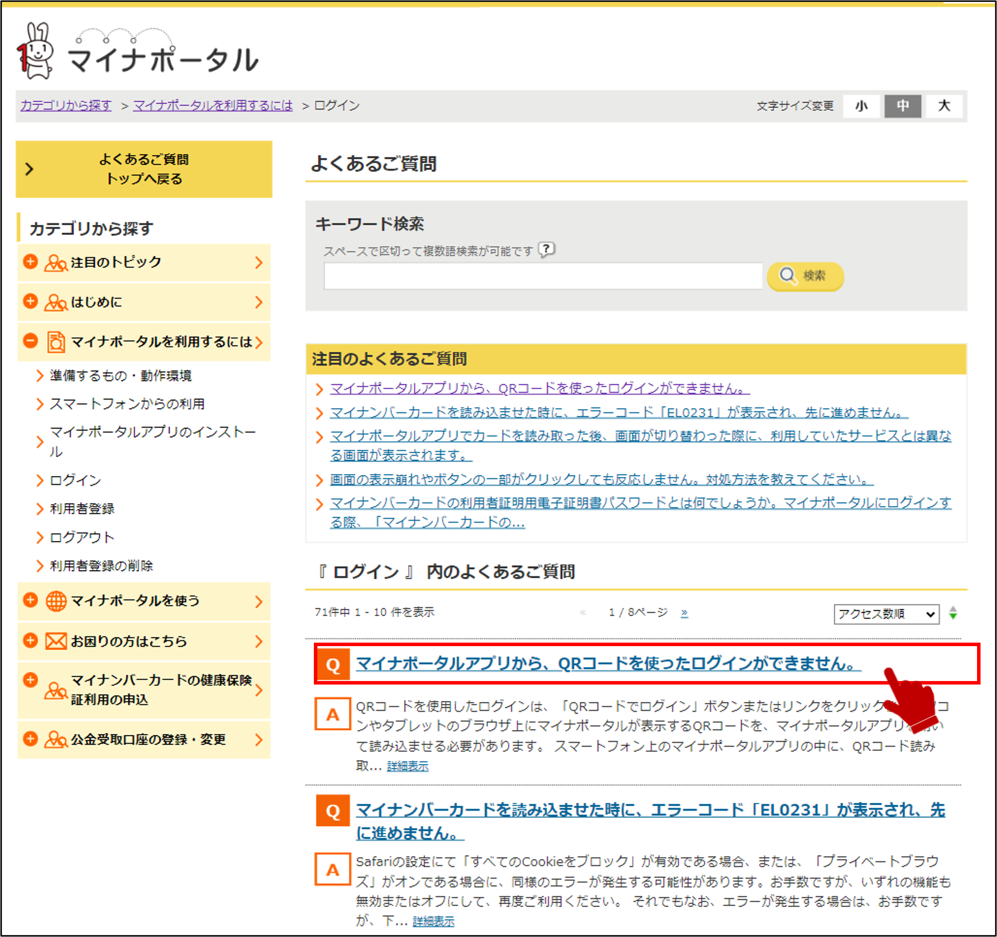 ログインまたは手続の検索・電子申請に関するよくあるご質問が一覧で表示されます。